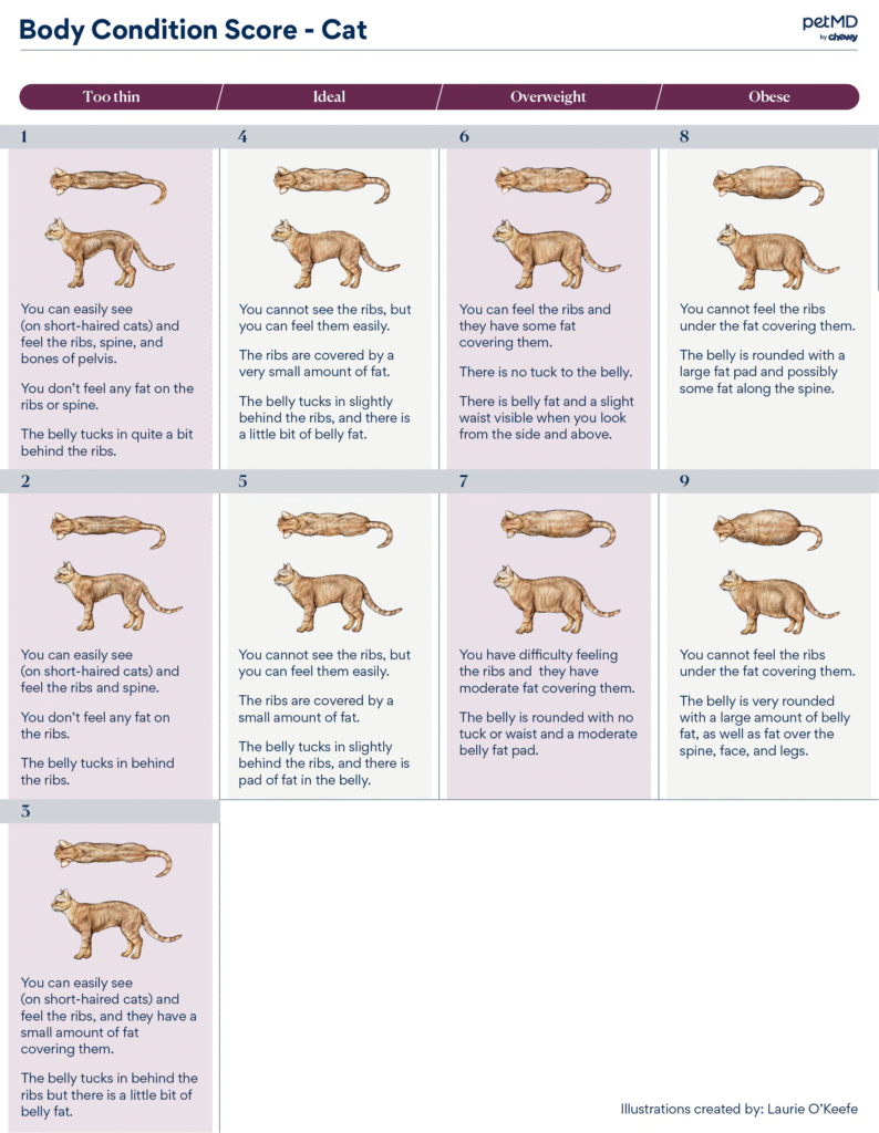 Cats that lack a waist or have thick fat over the ribs may be overweight, even if their weight seems normal on paper. Conversely, visible ribs and hips indicate underweight status.